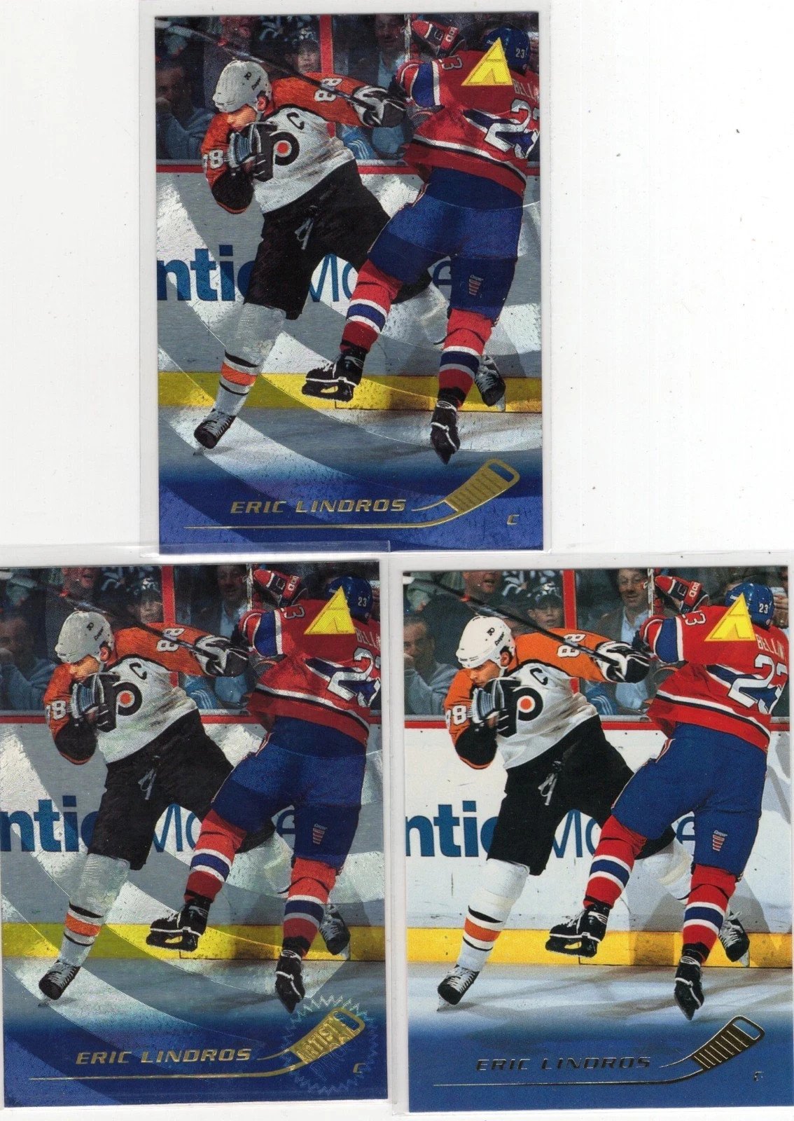 Delve into the world of sports memorabilia with this exclusive set of 1995-96 Pinnacle cards, featuring the iconic Eric Lindros. These cards are a must-have for enthusiasts and collectors alike, highlighting the promising rookie in his ice hockey element. The set includes three cards, each showcasing a different moment of Lindros’ burgeoning career, with the third card offering a unique Artist’s Proof edition that stands out in any collection.