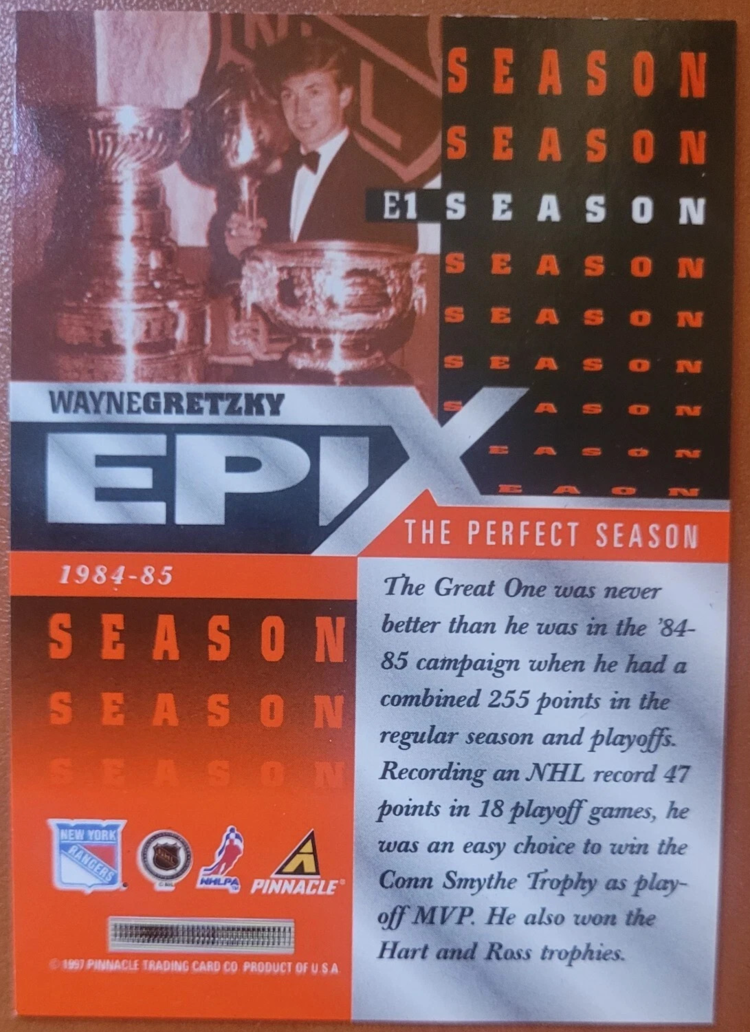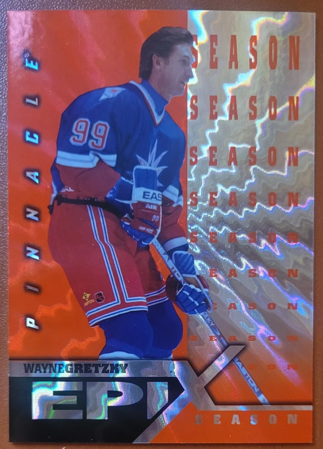 Step back in time with this 1997-98 Pinnacle Epix Season Orange Wayne Gretzky card, featuring the legendary ice hockey player during his iconic tenure with the New York Rangers. Card #E1 is a must-have for collectors and fans alike, capturing Gretzky’s presence and the essence of the sport in the mid-90s.