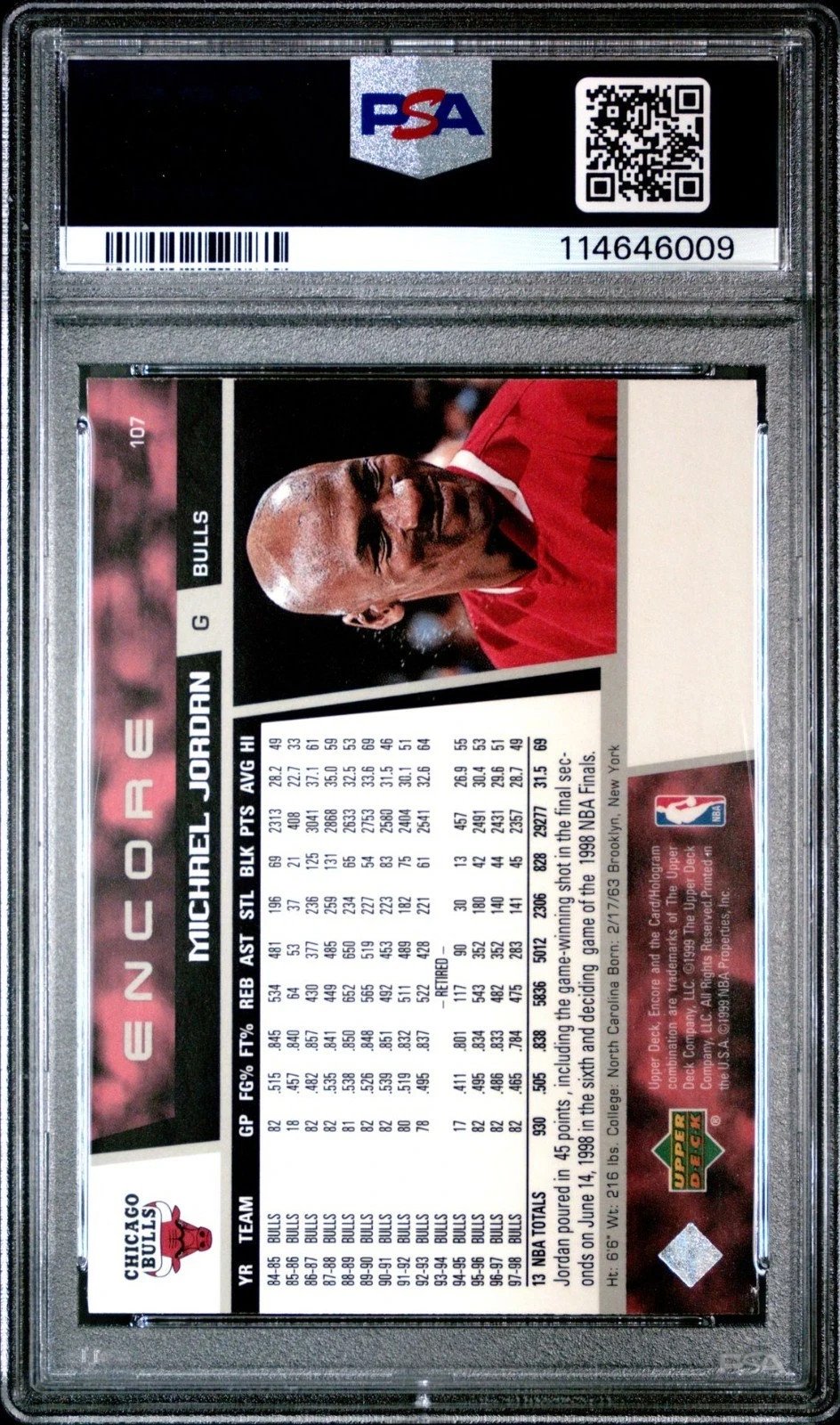 Capture a piece of basketball history with the 1998-99 Upper Deck Encore Michael Jordan #107, a must-have for collectors and fans alike. Featuring the legendary Chicago Bulls player in his prime, this card is a testament to Jordan’s enduring legacy in the sport. Encased in PSA 7 grading, it assures you of the card’s quality and authenticity, making it a valuable addition to any collection.