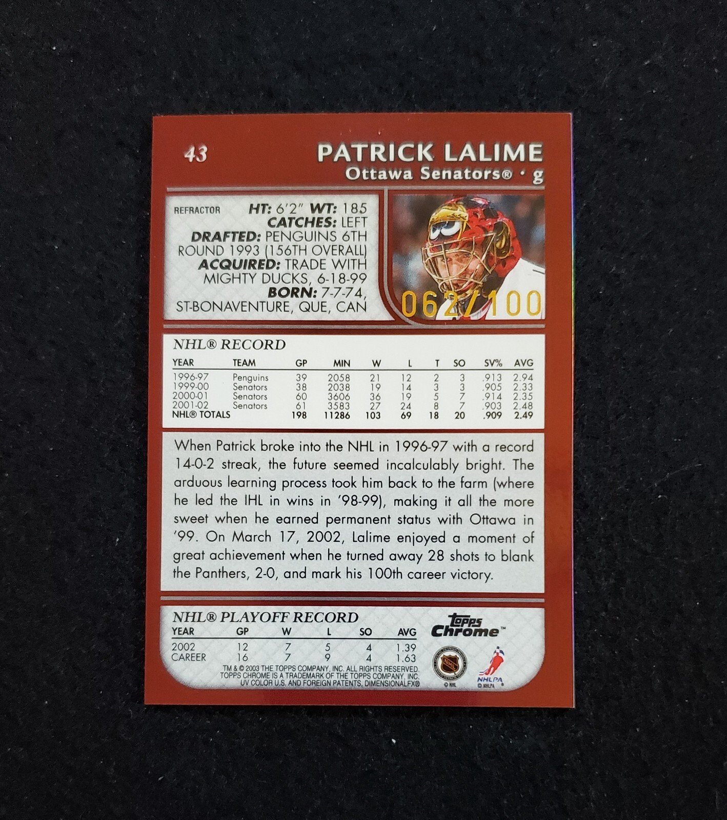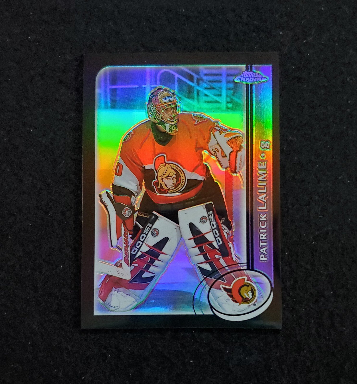 Capture a piece of ice hockey history with the 2002-03 Patrick Lalime Topps Chrome Black Refractor card. This card is a must-have for collectors and fans of the Ottawa Senators goalie, featuring a sleek black refractor finish that stands out in any collection. The card is part of the renowned 2002-03 Topps Chrome set, respected for its premium quality and design.