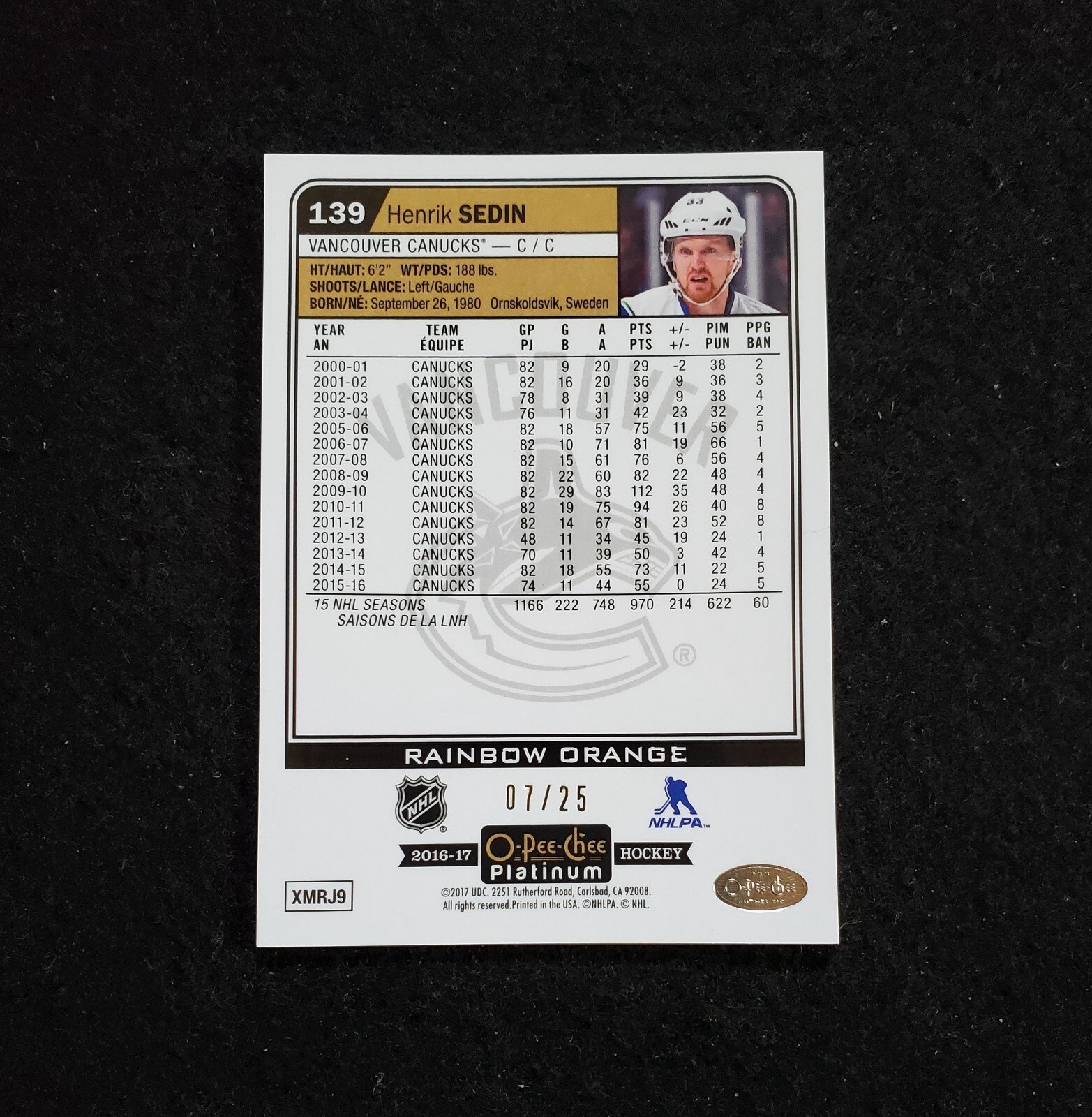 2016-17 Henrik Sedin O-Pee-Chee Platinum Rainbow Orange /25