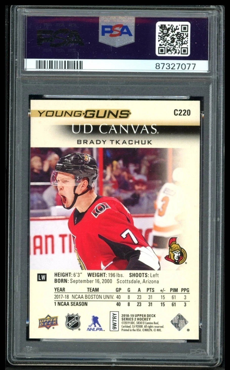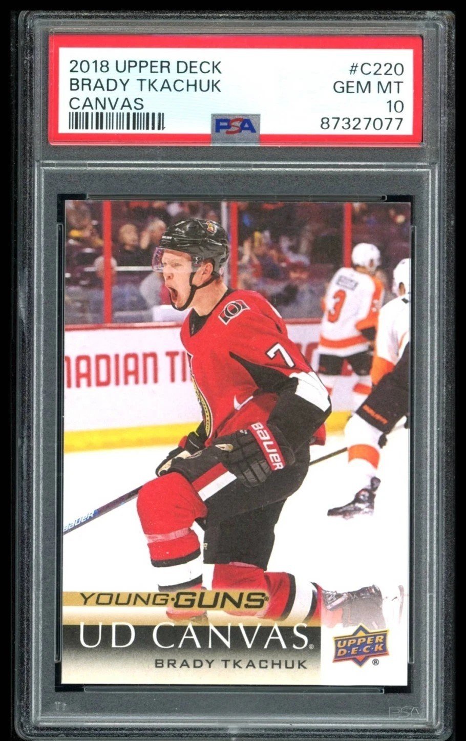 Elevate your collection with the 2018 Upper Deck #C220 Brady Tkachuk UD Canvas Young Guns Rookie card. Graded a perfect PSA 10, this card captures the essence of the Ottawa Senators’ rising star during the 2018-19 NHL season. The UD Canvas series is known for its quality and design, making this a standout piece.