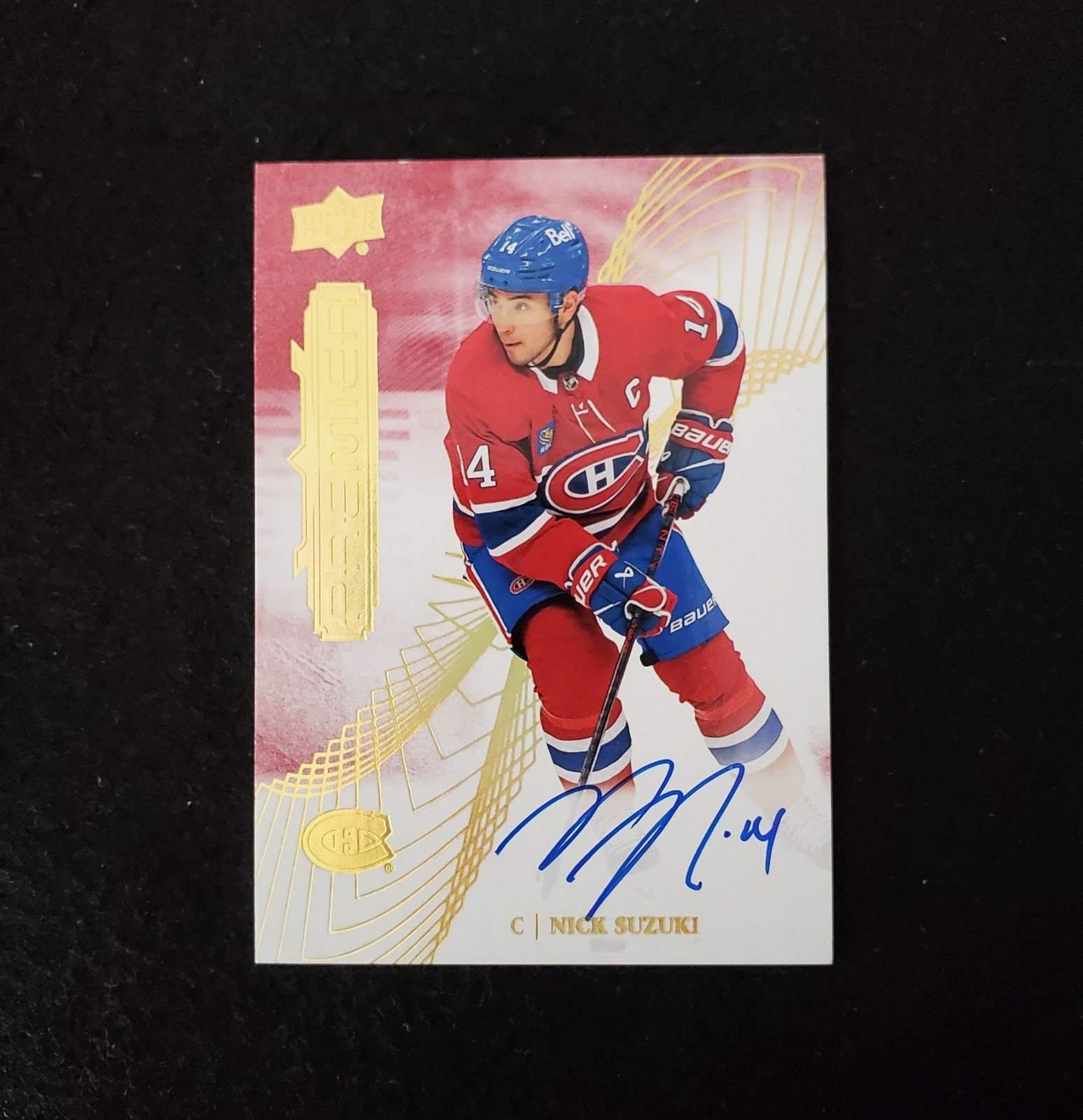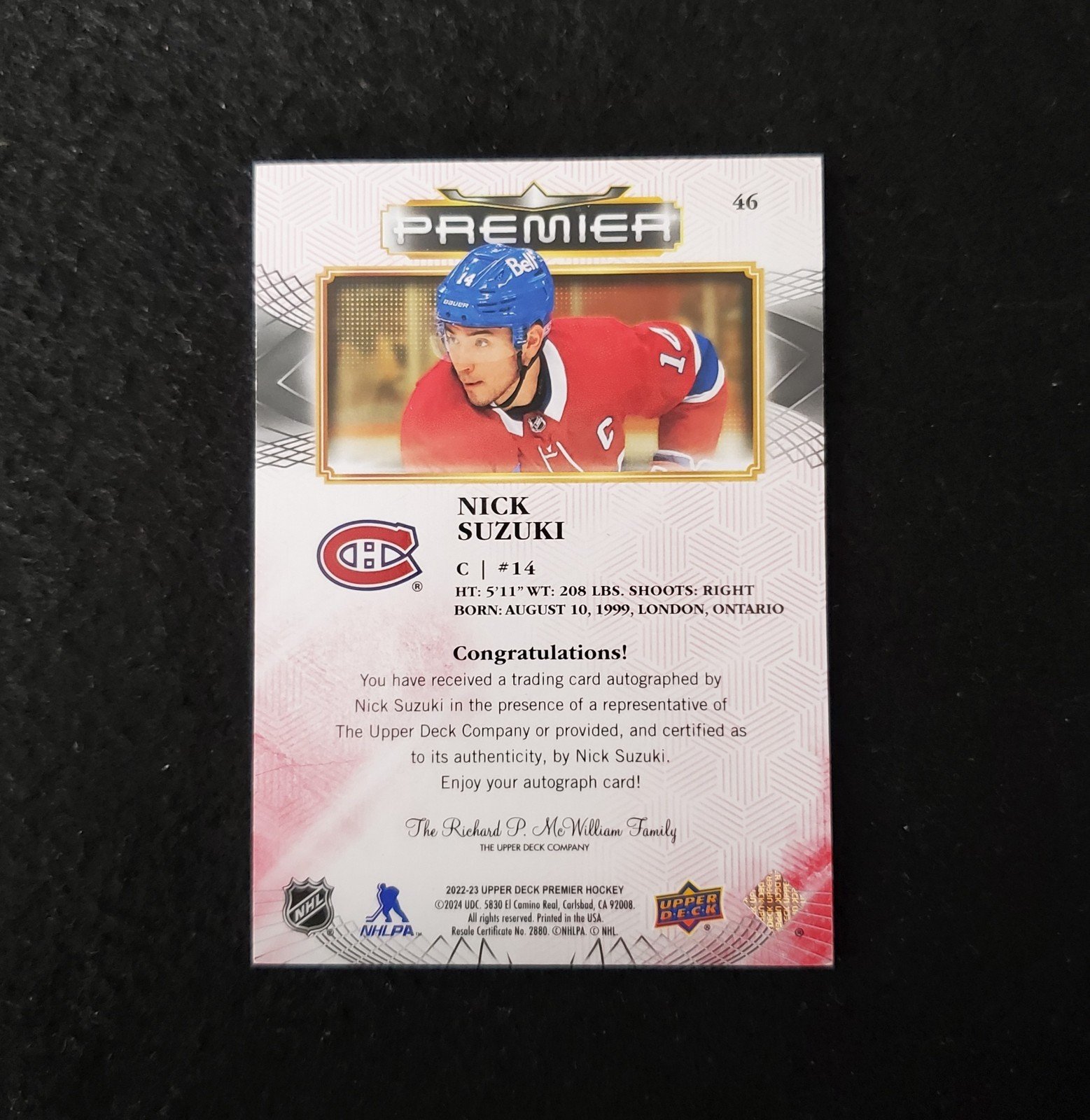 Elevate your collection with the 2022-23 Nick Suzuki Upper Deck Premier Auto trading card. This authentic piece, signed by Nick Suzuki himself, is a must-have for enthusiasts and fans of the Montreal Canadiens. The card, featuring the NHL star in action, is a true representation of his skill on the ice and a cherished memento for any collector.