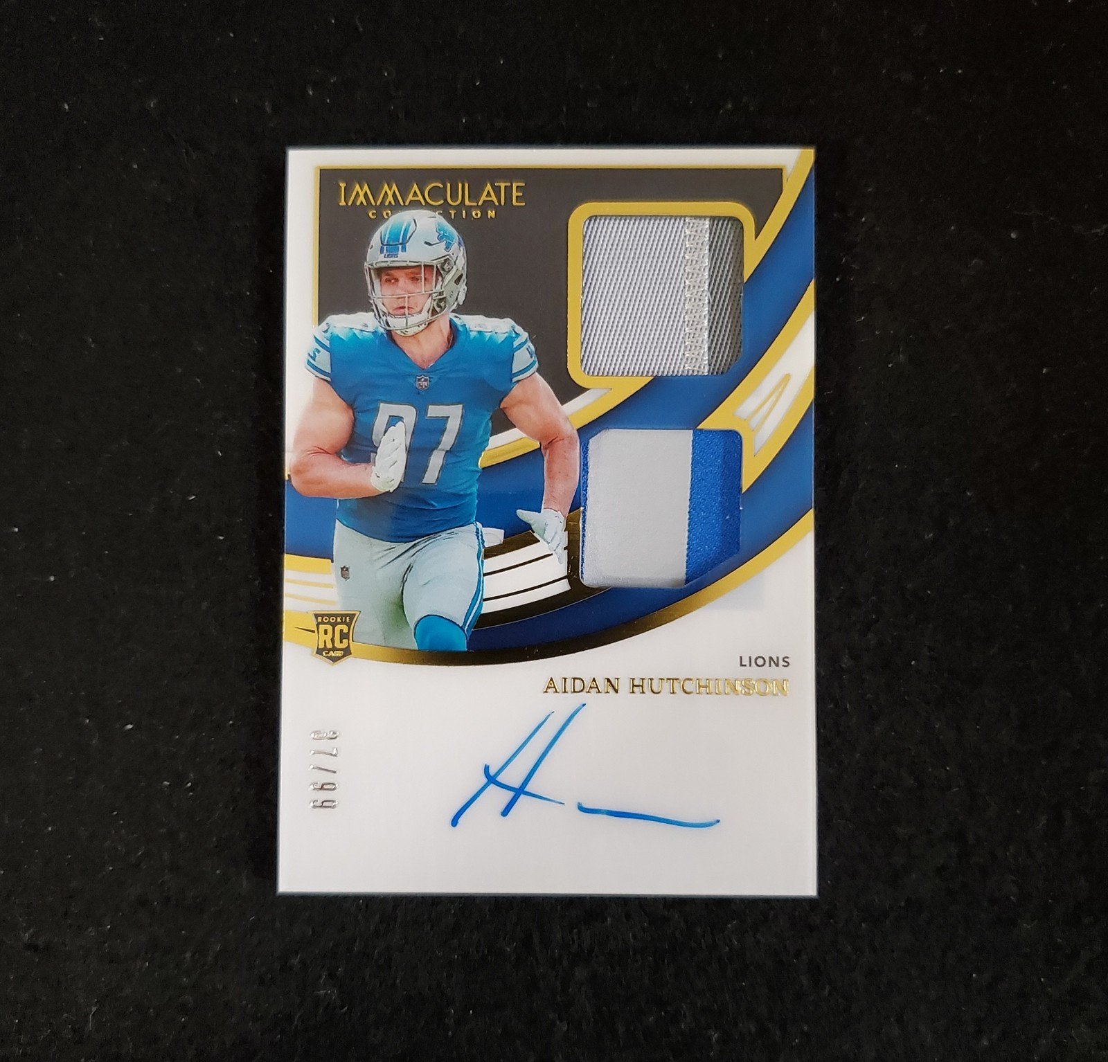 Elevate your collection with the 2022 Aidan Hutchinson Panini Immaculate Dual Rookie Patch Auto RPA, limited to just 99 pieces. As a standout card featuring the Detroit Lions’ defensive end, it boasts a premium patch and is complemented by a crisp, hard-signed autograph from Hutchinson himself, authenticated by Panini Authentic for unquestionable legitimacy.