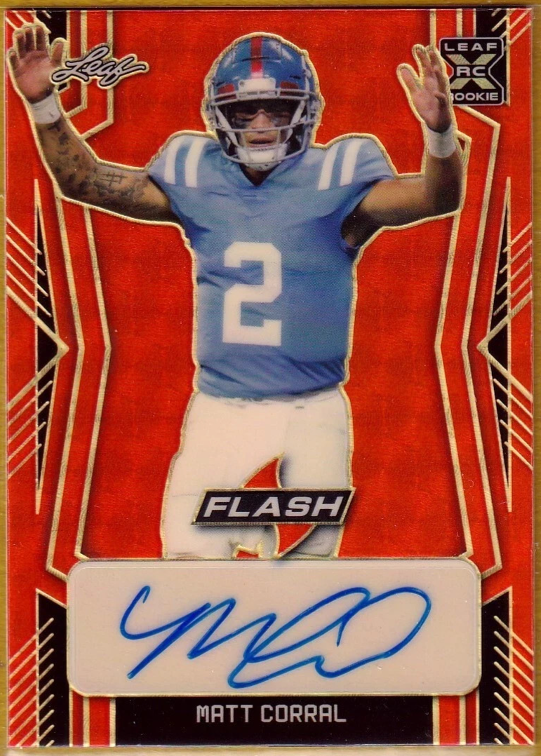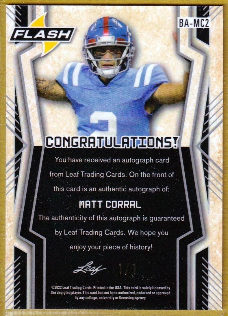 Elevate your sports memorabilia collection with the 2022 Leaf Flash Autographs Red Flood Gold Circles #BAMC2 Matt Corral RC AUTO 1/1 card. A true one-of-a-kind treasure, this card features the promising talent of Matt Corral, captured in a dynamic autographed format on high-quality card stock. With its eye-catching Red Flood Gold Circles design, this card stands out as a distinctive piece of sports history.
