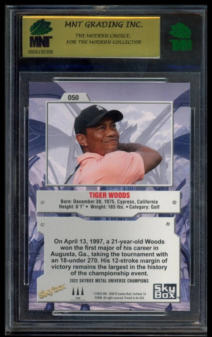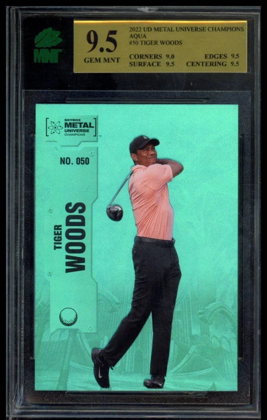 Elevate your collection with the 2022 Skybox Metal Universe Champions #050 Tiger Woods Aqua card, a must-have for enthusiasts and fans alike. This vibrant base aqua parallel showcases the legendary golfer Tiger Woods, capturing the essence of his dynamic presence on the green. Meticulously crafted by Skybox, this card is a standout piece from the 2022 season, further cementing its significance.