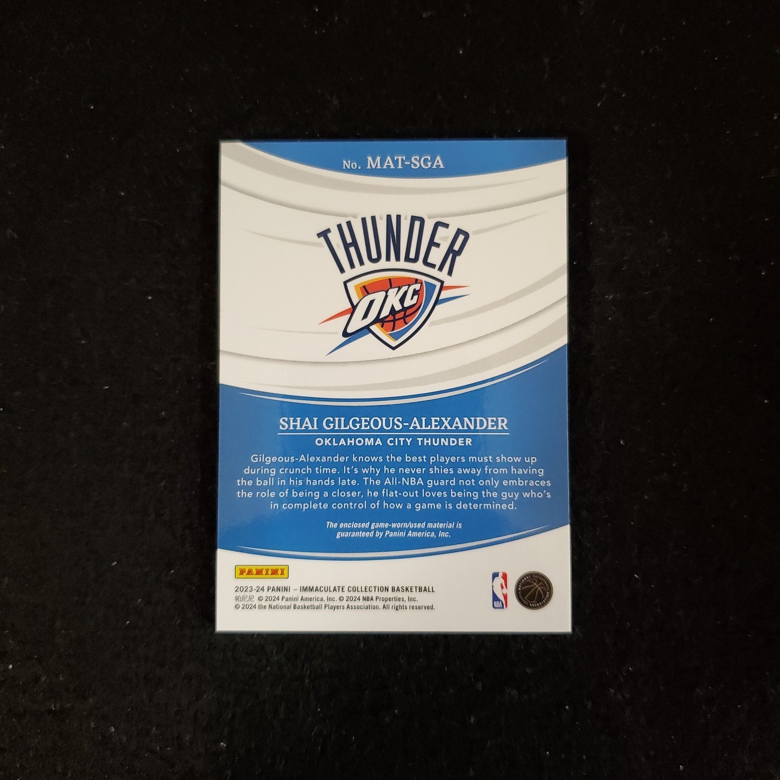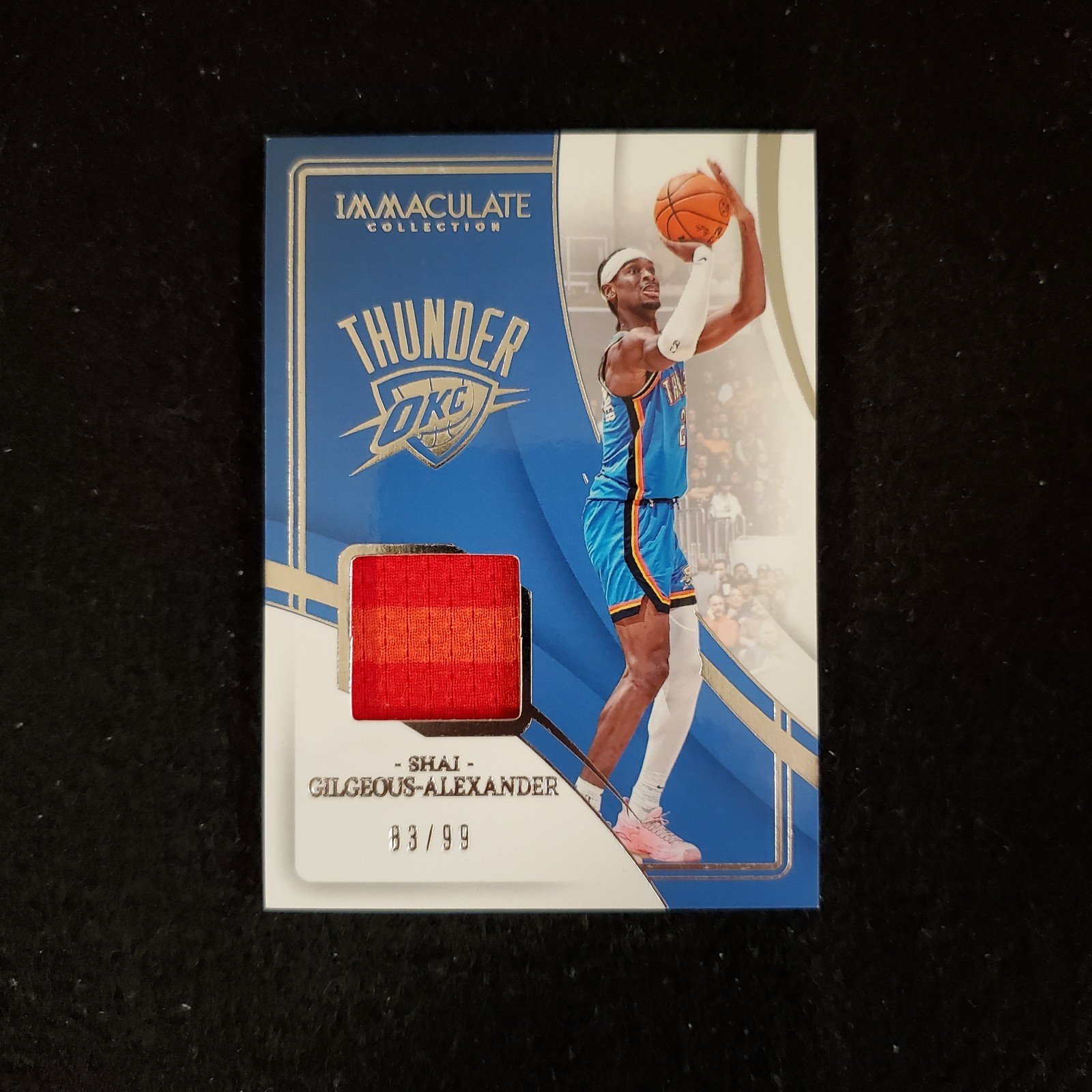Elevate your collection with the 2023-24 Shai Gilgeous-Alexander Panini Immaculate Patch, limited to just 99 pieces. This card features a premium patch and is serial numbered, ensuring its uniqueness and collectability. It’s a must-have for fans of the Oklahoma City Thunder or anyone who appreciates the art of sports memorabilia.
