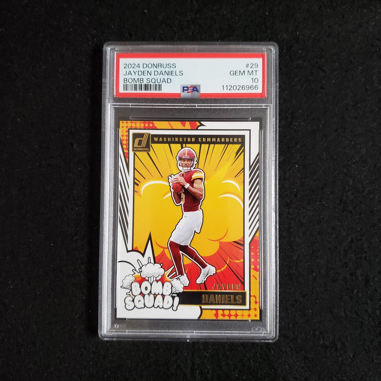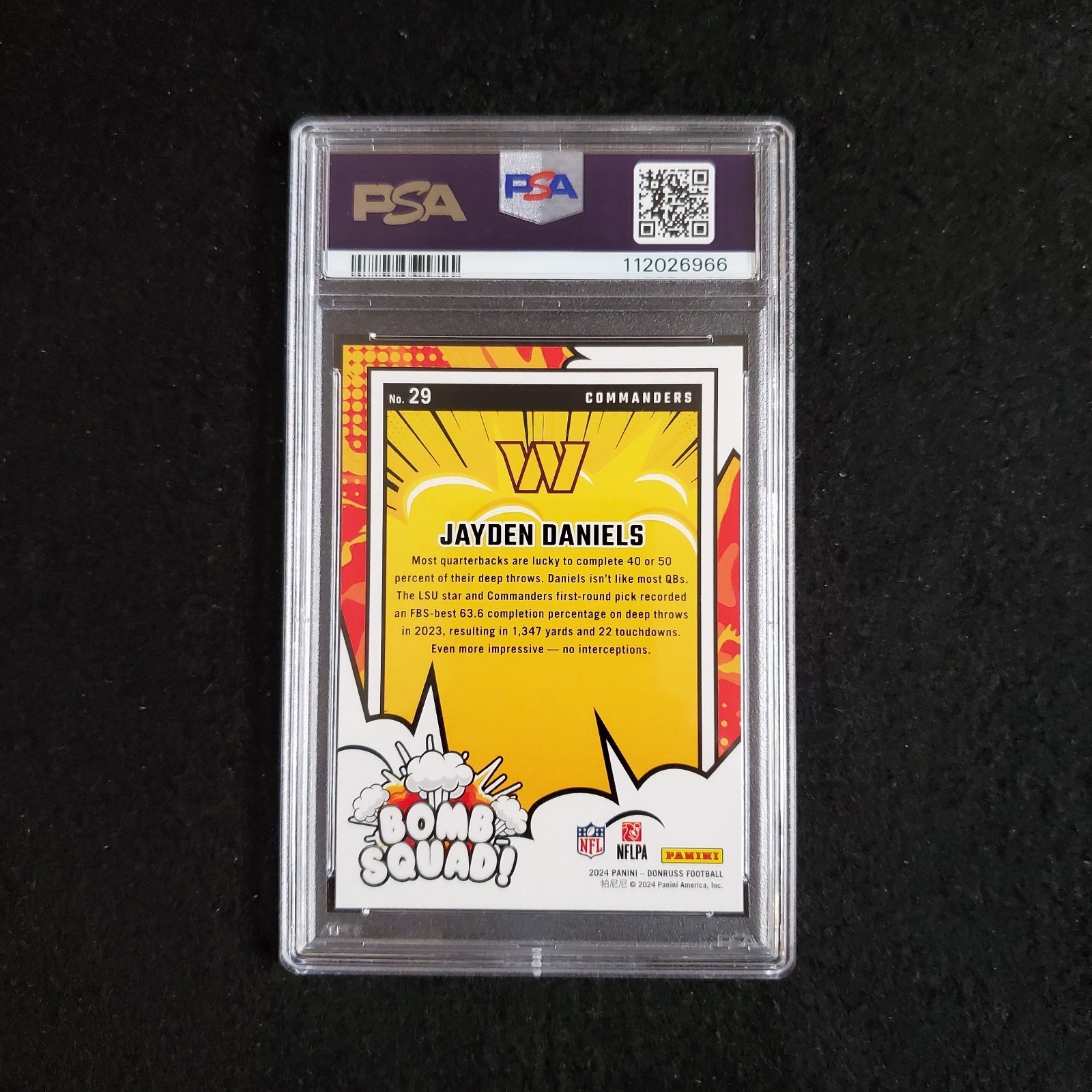 Step into the world of sports memorabilia with the 2024 Jayden Daniels Panini Donruss Rookie Bomb Squad Insert. This trading card is a must-have for enthusiasts and collectors alike, featuring the promising talent of Jayden Daniels, the Washington Commanders’ emerging star. The Rookie Bomb Squad Insert captures the essence of the athlete’s potential and is a testament to his growing legacy in the National Football League.