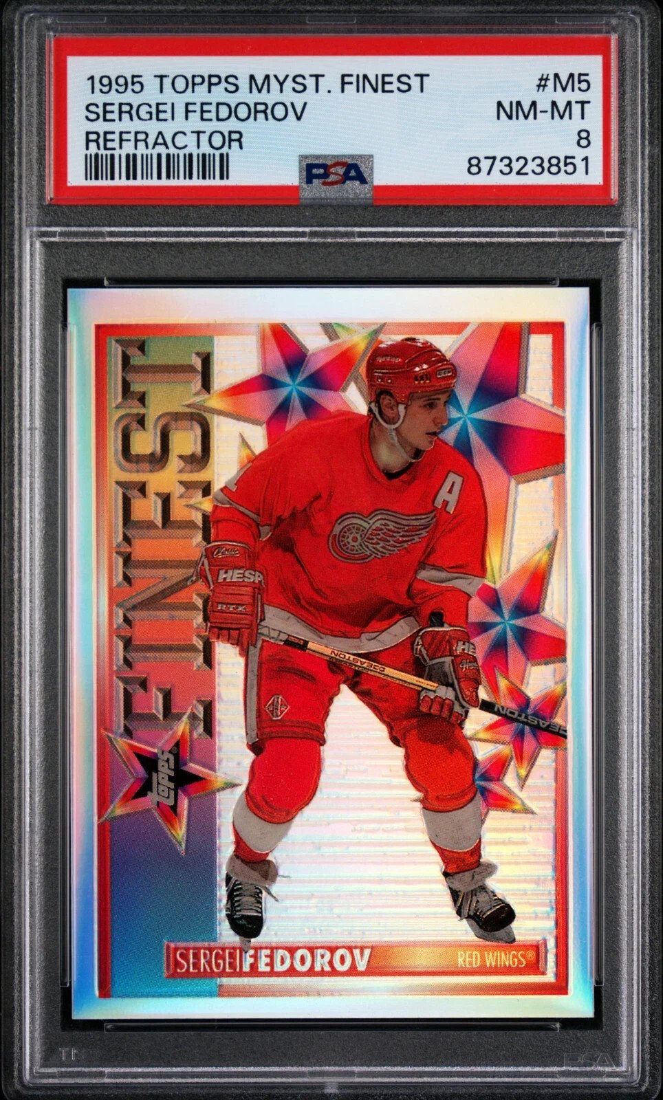 Immerse yourself in the nostalgia of the 1995-96 NHL season with this Sergei Fedorov Topps Finest Mystery Refractor card, #M5. Representing the Detroit Red Wings, this card captures the essence of Fedorov’s dominant presence on the ice. A prized piece for collectors, it’s an original issue from the renowned Topps Finest set, reflecting the quality and craftsmanship of the era.